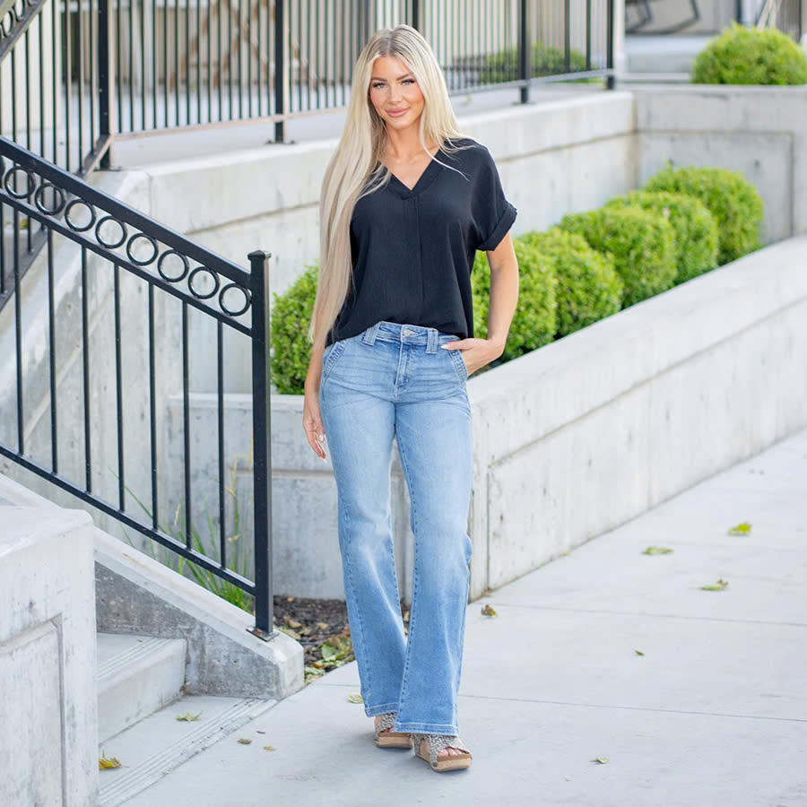 The High Rise Wide Flare Jeans offer a timeless, tailored look with modern comfort.